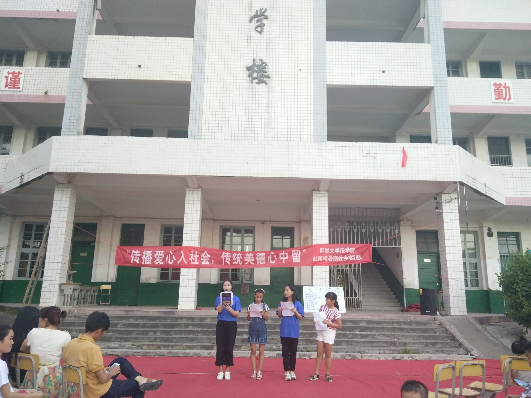 为了感谢实践期间汤坑村村民对实践队成员的帮助与关爱,威廉官网中国官方网站赴南靖实践队于7月19日举办了一场小型文娱汇演来感谢大家。莅临汇演现场的有:汤坑村党支部书记张志猛、汤坑村村长、计生会会长和汤坑小学教师石老师。