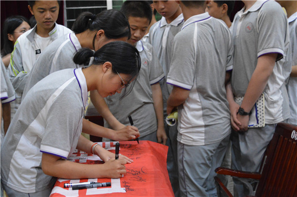 活动分为普法讲座、提问解答、横幅签名、法制图片展览、及授旗仪式等环节。活动中,陈夏溦老师通过“是什么”、“为什么”、“怎么做”三个层次对“校园暴力”进行讲解分析,并结合具体案例以及青少年的生理、心理及该年龄阶段的特点,分析产生校园暴力的原因及应对措施,为马甲中学师生们带来别开生面的法制教育讲座。