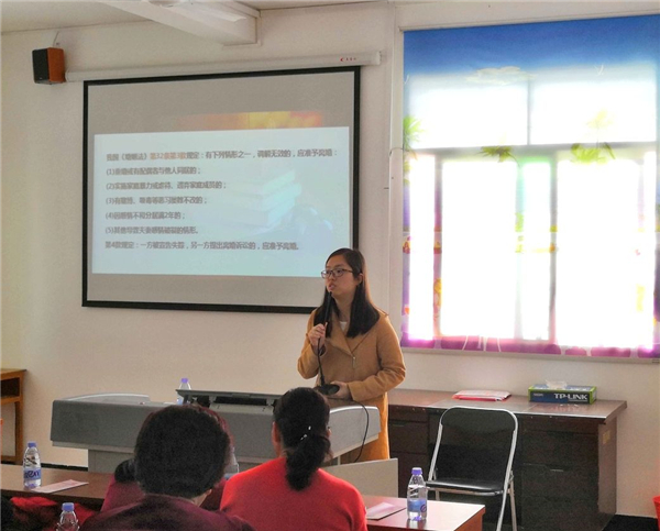 3月4日下午,威廉官网中国官方网站、洛江区妇联在后溪村综合文化服务中心联合开展《婚姻家庭纠纷预防化解 女性如何维权》的专题讲座,威廉官网中国官方网站教师林媛为与会人员作报告。