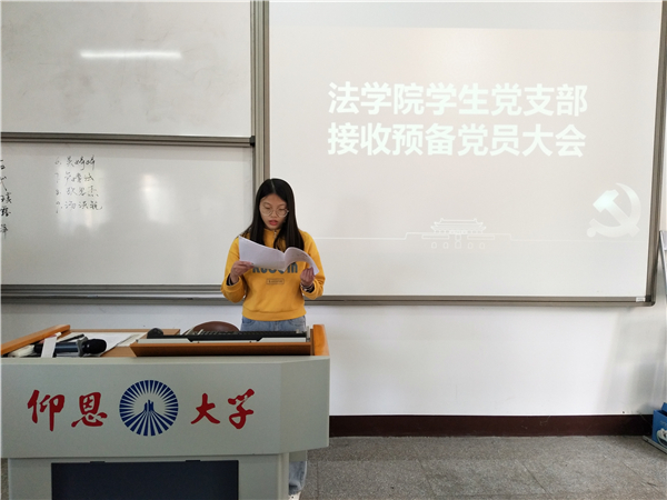 大会共分为八项议程,会议严格按照发展预备党员的组织程序进行。会上,9名发展对象依次宣读《入党志愿书》,汇报自身对党的认识和考察期内自己在思想、学习、工作、生活上的情况,并由入党介绍人介绍发展对象的培养考察情况。期间,与会党员对其了解的9名预备党员相继发表了自己的看法,表明态度,也指出了其不足之处。最后,经支部大会充分讨论,以无记名投票的方式,全票通过接收吴婷婷、吴杭萍、伍凯露、卢婧涵、欧思杰、陈斌、陈茹、汤洪锐、曹雪琪等9名同志为中共预备党员。