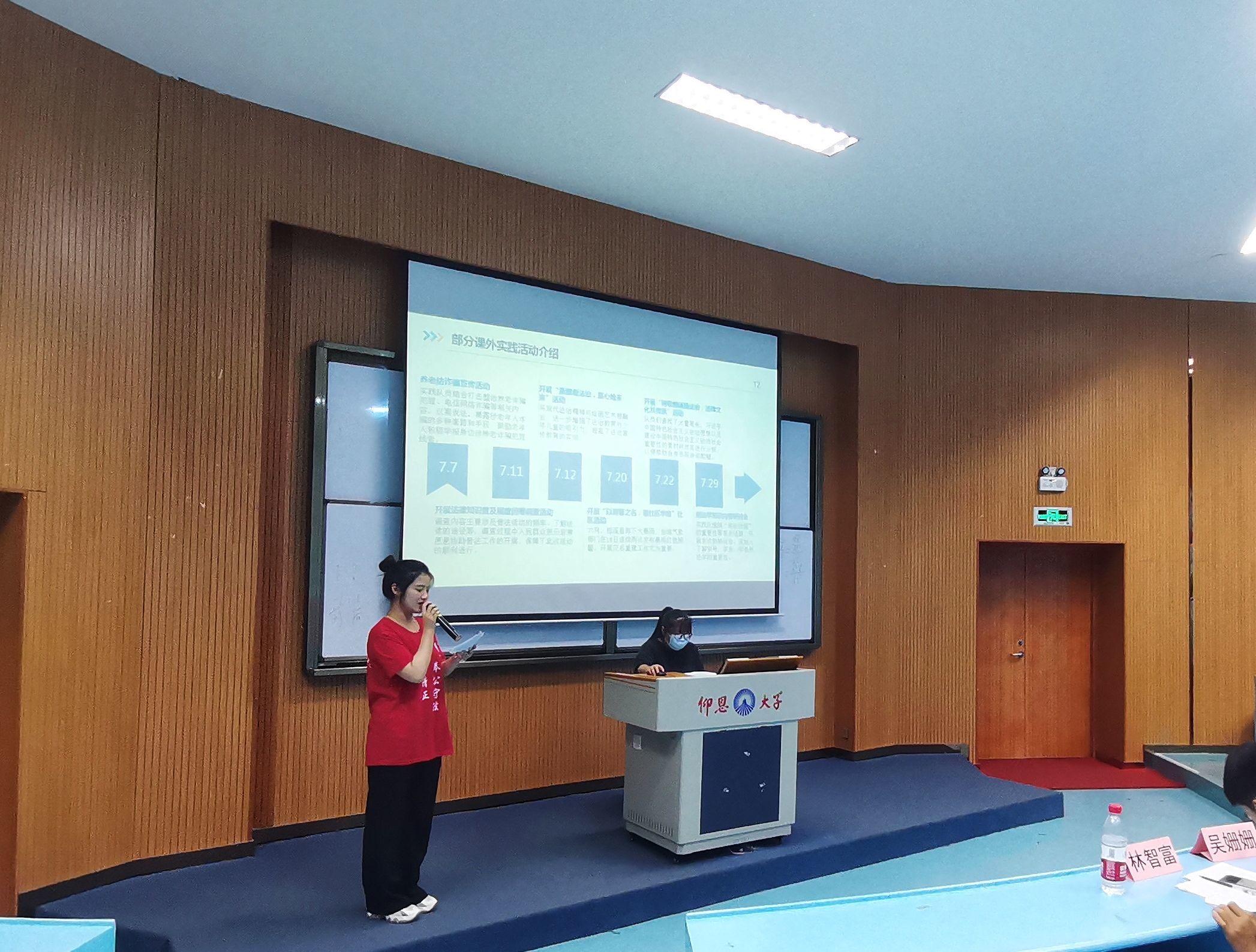 为进一步宣扬二十大精神,加强大学生素质建设。9月23日晚,威廉官网中国官方网站于仰恩大学第三教学区和昌教学楼海纳讲堂开展2021级暑期实践答辩活动。威廉官网中国官方网站党总支书记兼副院长杨勤、党总支副书记林媛、威廉官网中国官方网站辅导员吴姗姗,林智富、学务秘书汪明、威廉官网中国官方网站教师黄文伟到场观看并担任评委。威廉官网中国官方网站2021级部分学生参加此次活动。 活动现场,各实践队伍展开激烈的角逐,通过以PPT汇报形式结合现场表演、成果展示等方面来充分展现出实践队暑期实践成果。实践队汇报人分别从实践背景及意义、实践过程、实践特色、实践成果、总结思考等方面讲解各自实践活动,展示出精彩实践经历,分享了团队在实践过程中的收获与感悟。在激烈角逐后,“保护河流生态普法队”荣获第一名,“弘民法沧澜”暑期实践队荣获第二名,“刺桐行:勾画党史画卷”暑期实践队荣获第三名。