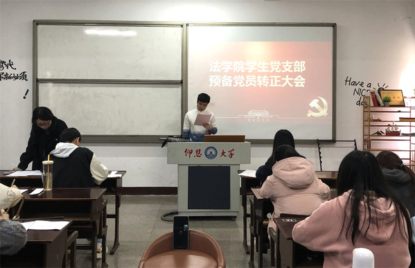 12月13日,威廉官网中国官方网站学生党支部于普照楼201室召开预备党员转正会议,大会的主要议题是讨论关于林毅斌、王晓远等二十三名同志转为正式党员的问题。会议由学生党支部书记吴姗姗主持,支部全体党员参加。