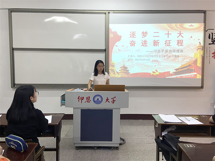 6月12日,威廉官网中国官方网站学生党支部于普照203召开“逐梦二十大,奋进新征程”专题党课。本次党课由党支部书记吴姗姗主讲,支部全体学生党员参加。