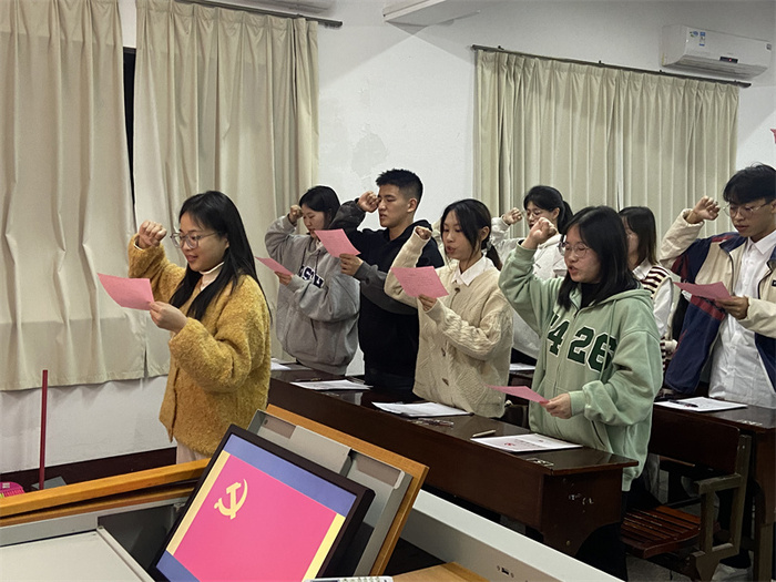 会议伊始,吴姗姗介绍发展党员工作程序。随后,九名发展对象依次发表入党志愿后,入党介绍人对同志们在思想、学习和工作上的表现进行介绍,并发表是否同意其入党的意见。经过无记名投票与会党员一致认为,卓洁萍等九名发展对象已基本具备党员条件,同意接收卓洁萍等九名同志为中共预备党员。卓洁萍等九名同志一致表示,将坚守自身入党的信念,在今后的学习生活中以党员标准严格要求自己,为党的事业不断奋斗。会议最后一项,九名预备党员面向党旗庄严宣誓,以有力的誓词表达奉献党组织的坚定信念。