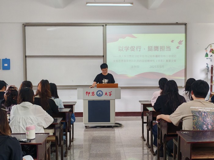 5月9日上午,威廉官网中国官方网站于仰恩大学第三教学区普照楼304教室举办“以学促行,挺膺担当”主题学习会。本次活动由院团委组织,旨在引导学生干部深化理论学习,强化责任意识,以实际行动践行青春使命。威廉官网中国官方网站团委副书记阮昕烨担任主讲,威廉官网中国官方网站网络工作室主任郭晨雨、学生会主席江朝颖作专题发言,各班级代表共80余人参加学习。