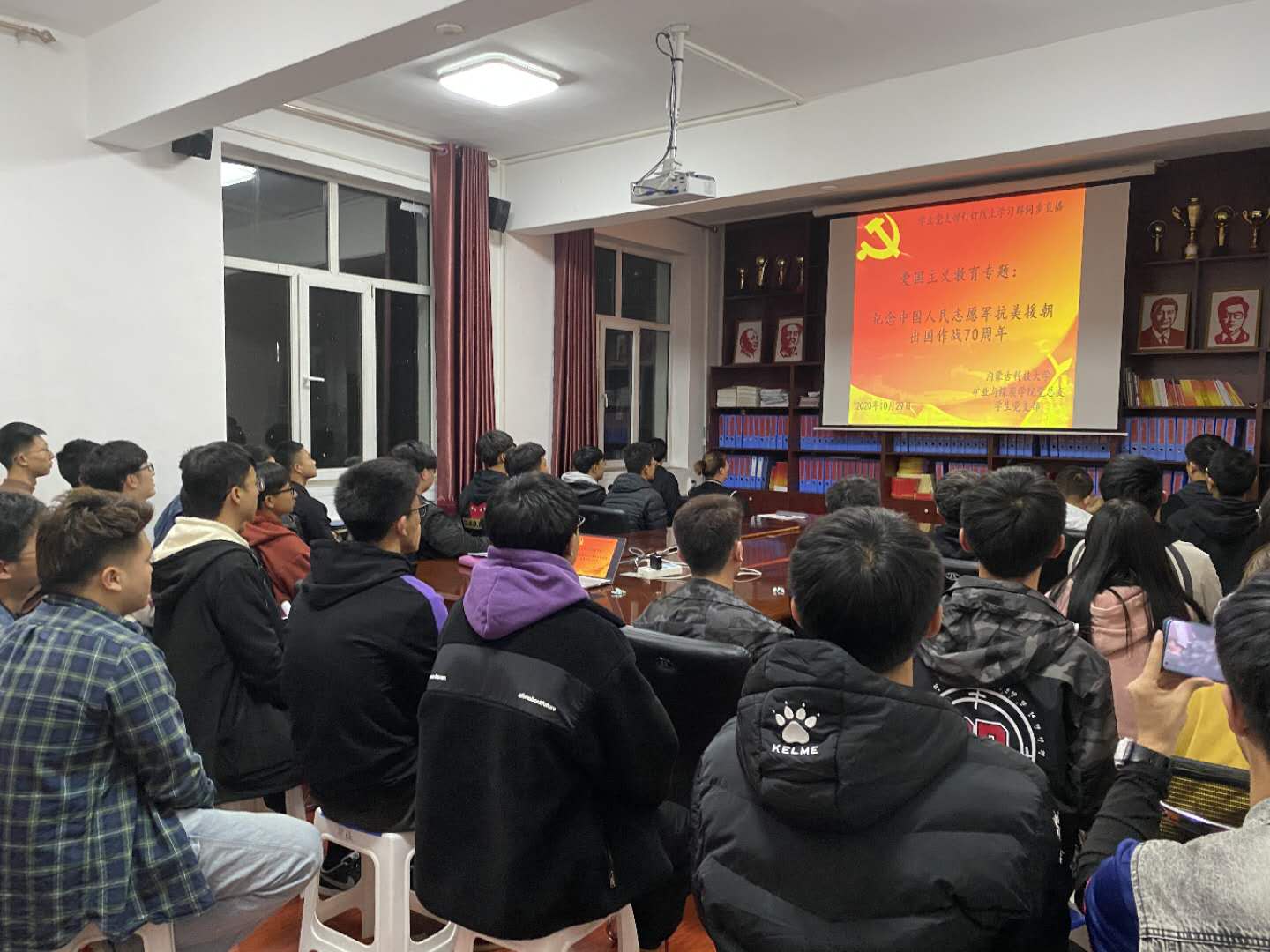 为纪念中国人民志愿军抗美援朝出国作战70周年,pg娱乐电子游戏官网入口党总支于2020年10月29日晚上19:00,在临曦楼二楼党员之家线上线下同步开展专题理论学习活动。本次学习内容是爱国主义教育专题:观看《纪念中国人民志愿军抗美援朝出国作战70周年》视频。