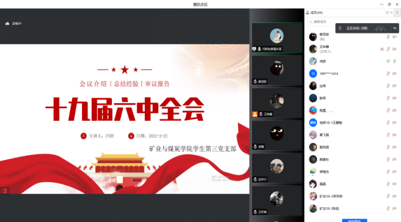 2022年3月22日晚19:30,pg娱乐电子游戏官网入口学生第三党支部于腾讯会议平台召开党员党课学习,本次学习的主题是:学习贯彻党的十九届六中全会精神。领学人:闫妍同志。
