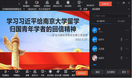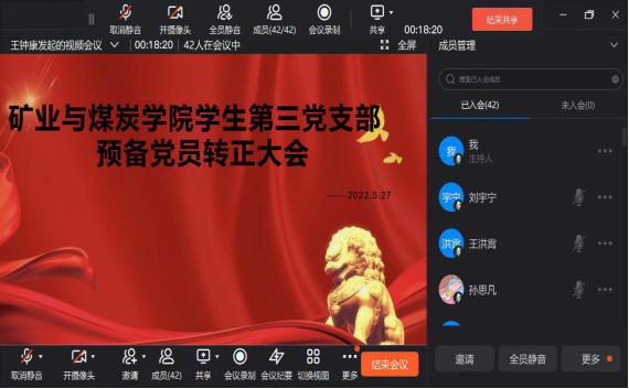 2022年5月27日下午16:20,pg娱乐电子游戏官网入口学生第三党支部于钉钉平台线上开展预备党员转正大会。本次会议由支部书记闫妍同志主持,支部全体党员参加。