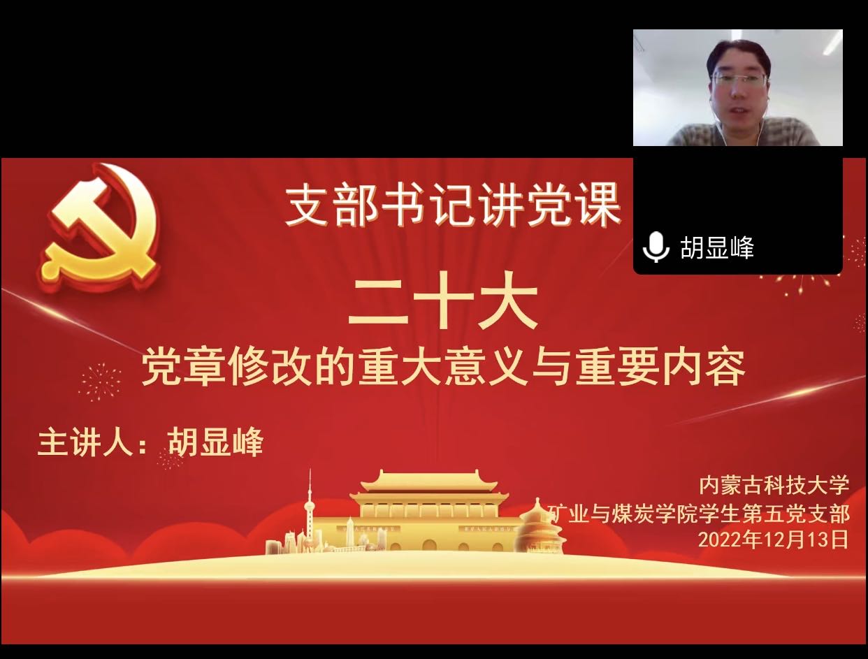 为引导广大党员深入学习贯彻党的二十大精神,更加自觉地学习党章、遵守党章、贯彻党章、维护党章,pg娱乐电子游戏官网入口学生第五党支部于2022年12月13日组织开展支部书记讲党课,党课由支部书记胡显峰主讲,支部全体党员参加学习,本次学习利用腾讯会议线上开展。
