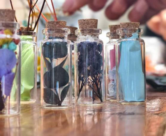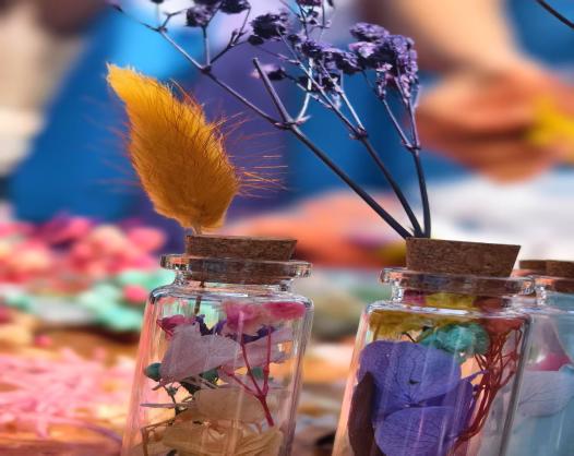 活动以小玻璃瓶为载体,将彩色的花与树叶封存入瓶,让自然的诗意与内心的独白在此相遇。