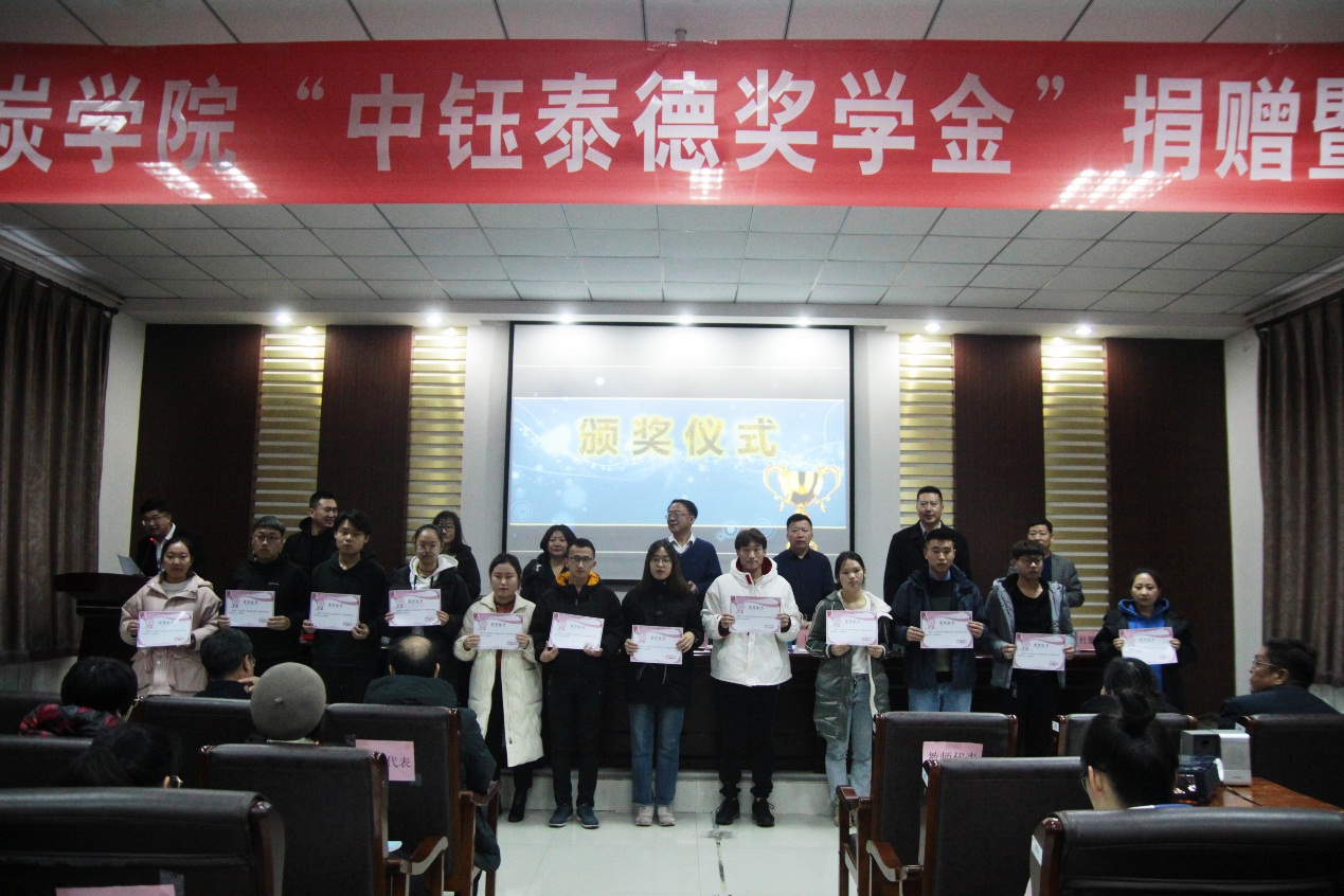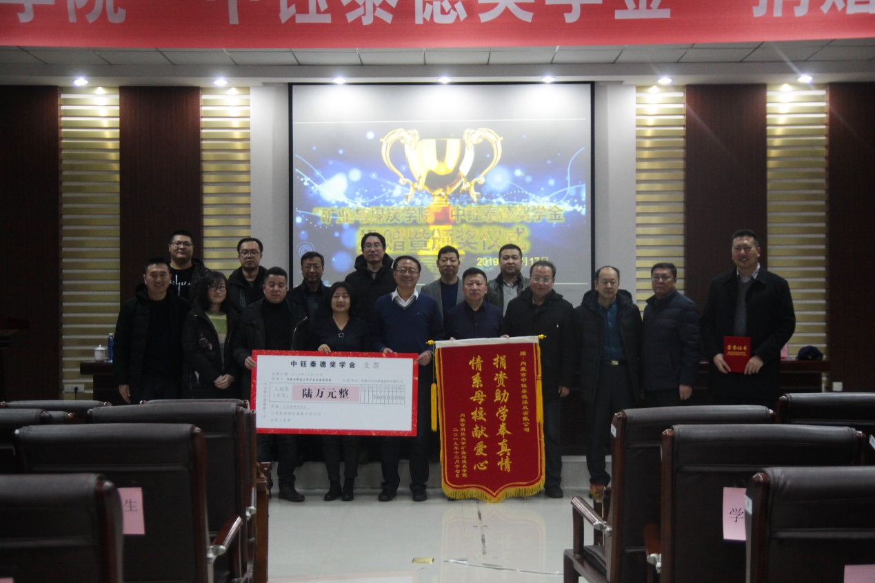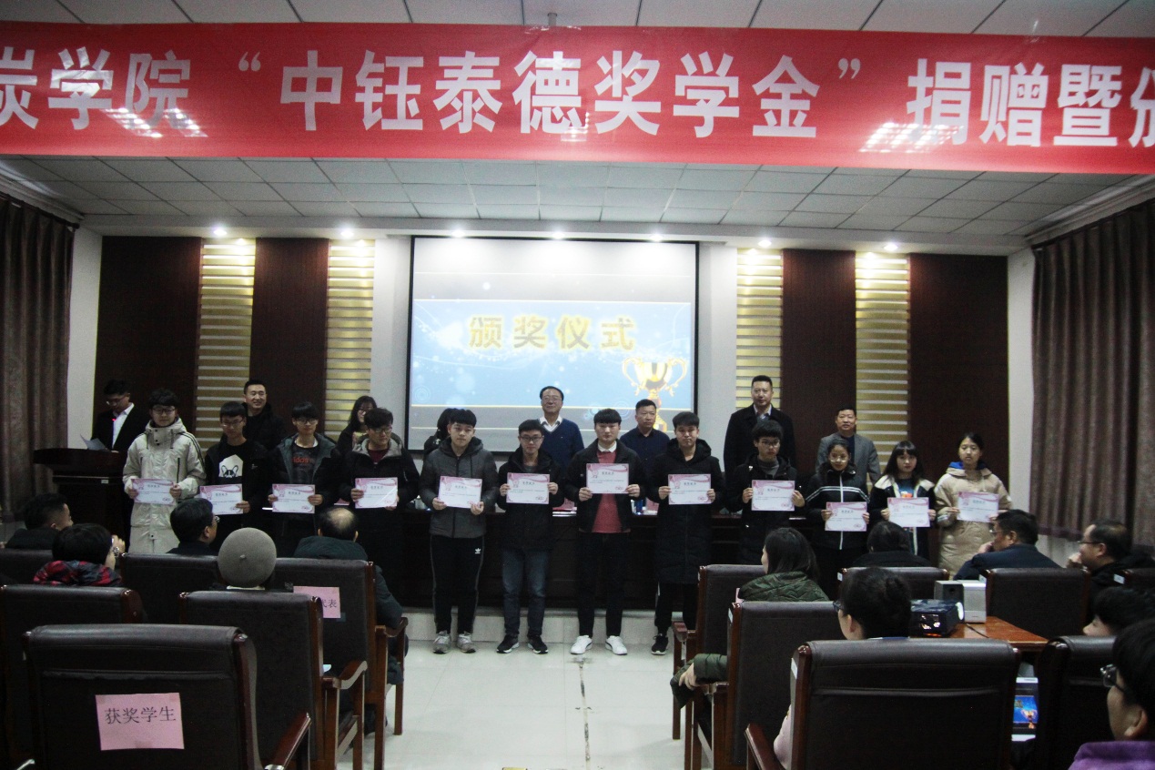 2019年12月17日下午16:30,pg娱乐电子游戏官网入口在实验实训楼会议室举行了“中钰泰德奖学金”捐赠暨颁奖仪式。出席本次会议的领导有:内蒙古中钰泰德煤炭有限公司董事长兼总经理王军、副总经济师王晓燕、人力资源部经理陶京、人力资源部社保主管李雪;pg娱乐电子游戏官网入口党总支书记王建国、副书记副院长杜鹏东、副院长杨包生、各系部主任,以及辅导员。