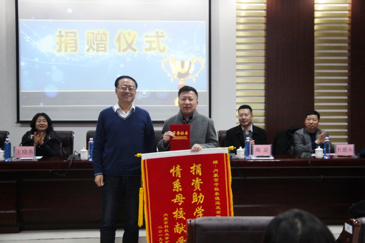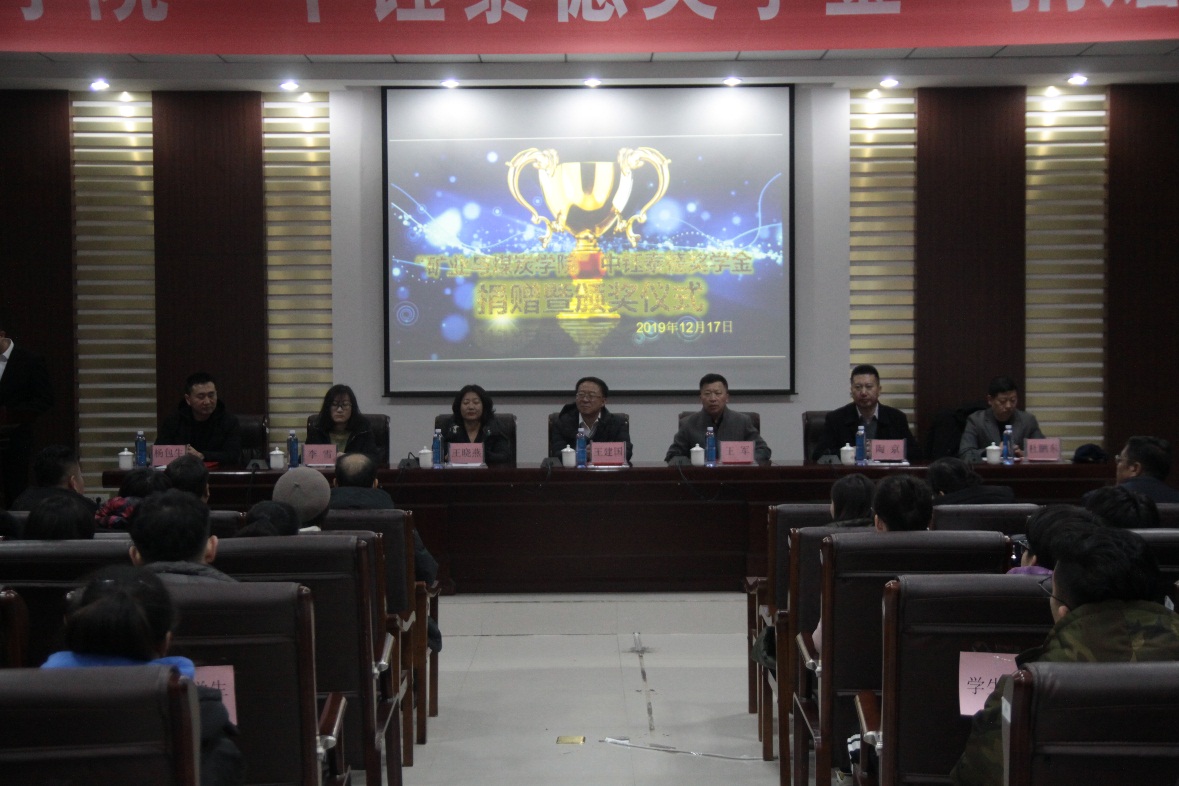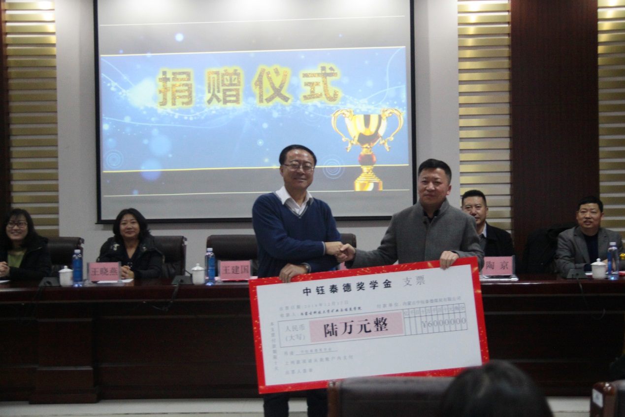 2019年12月17日下午16:30,pg娱乐电子游戏官网入口在实验实训楼会议室举行了“中钰泰德奖学金”捐赠暨颁奖仪式。出席本次会议的领导有:内蒙古中钰泰德煤炭有限公司董事长兼总经理王军、副总经济师王晓燕、人力资源部经理陶京、人力资源部社保主管李雪;pg娱乐电子游戏官网入口党总支书记王建国、副书记副院长杜鹏东、副院长杨包生、各系部主任,以及辅导员。