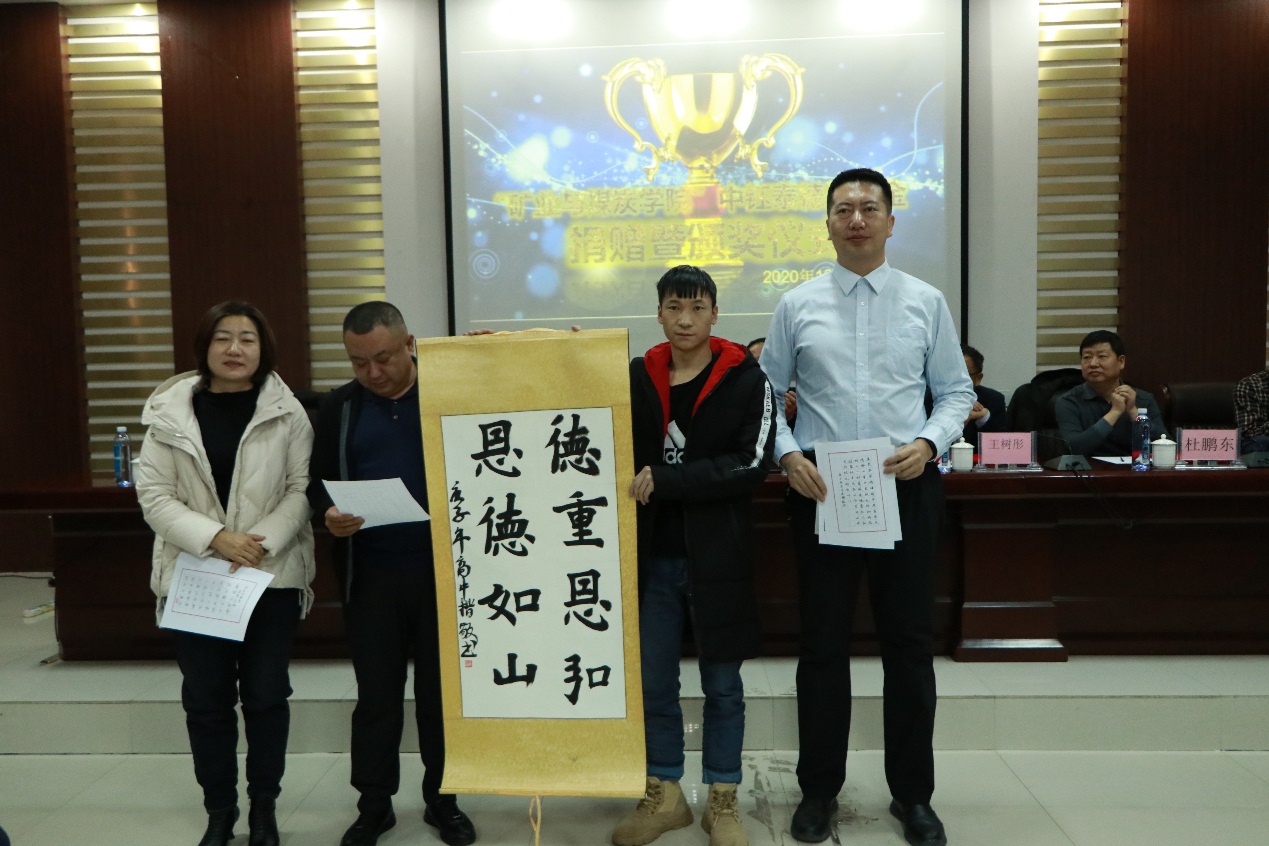 随后,副总经理王维利代表公司向pg娱乐捐赠六万元奖学金,王建国书记也代表学院向公司表示谢意并回赠了荣誉证书与锦旗。杜鹏东书记宣读了本次30名获奖学生名单,之后在场嘉宾为获奖学生颁发了获奖证书。接着,获奖学生高中凯同学用书法作品的方式表达了对中钰泰德公司的感谢。获奖学生代表高冬也发表了获奖感言,承诺将会珍惜本次奖励和荣誉,不断努力,认真学习,取得更优异的成绩,创造更美好的未来。