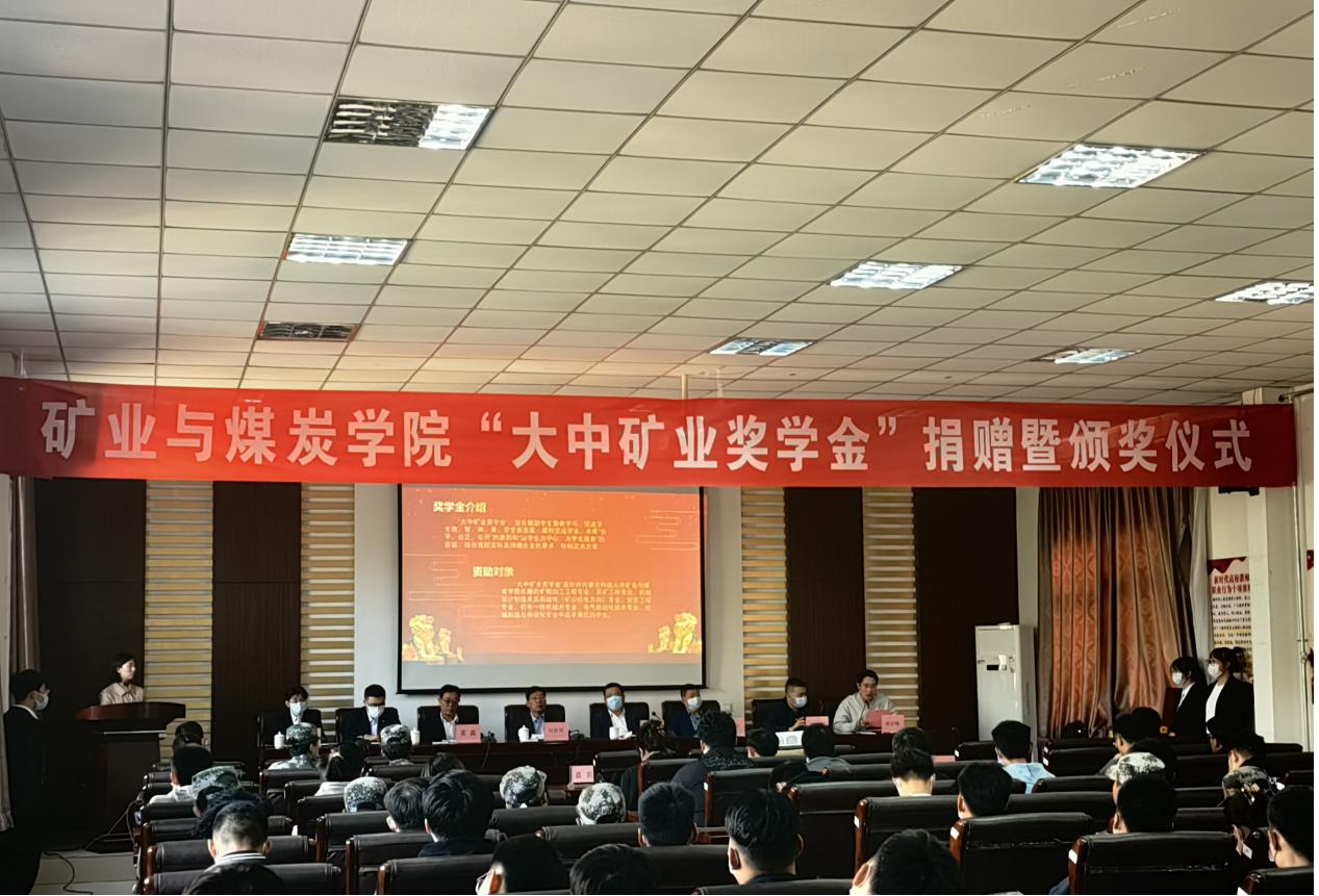 2022年9月23日下午15:00,pg娱乐电子游戏官网入口在实验实训楼会议室举行了“大中矿业奖学金”捐赠暨颁奖仪式。pg娱乐电子游戏官网入口党委副书记、校长任慧平;内蒙古大中矿业股份有限公司党委书记刘鲁明、总经理董鑫、人资培训中心总监王如海、副总监梁艳;pg娱乐电子游戏官网入口党委书记杜鹏东,副书记、副院长孙建平,学生工作办公室主任胡显峰、辅导员以及学生代表参加仪式。仪式由学生工作办公室副主任吴艳丽主持。