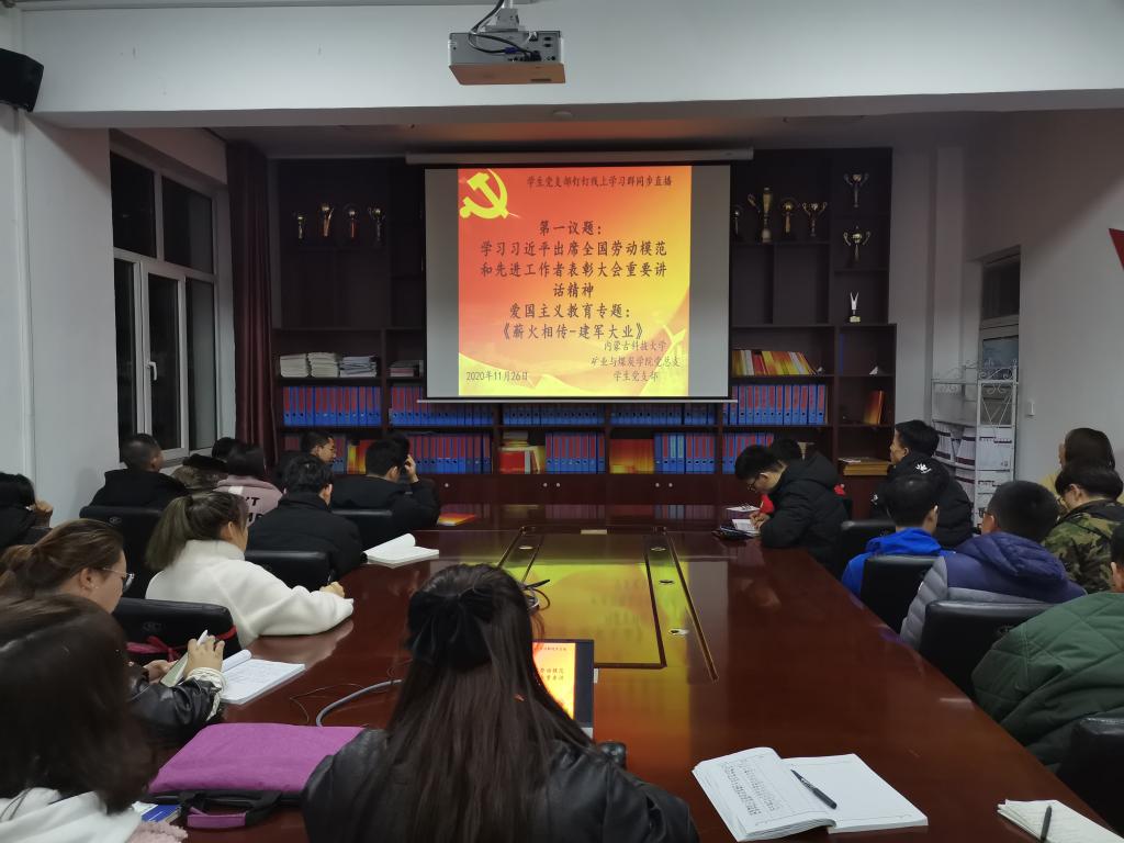 为大力弘扬劳模精神,激励和带动全体学生,pg娱乐电子游戏官网入口党总支于2020年11月26日晚上19:30,在临曦楼二楼党员之家线上线下同步开展专题理论学习活动。本次学习内容是:第一议题:学习习近平出席全国劳动模范和先进工作者表彰大会重要讲话精神;爱国主义教育专题:观看《薪火相传-建军大业》视频。